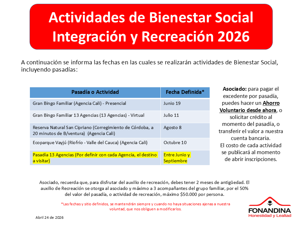 ¡Programate para participar y disfrutar las actividades de Bienestar Social!