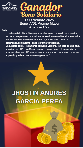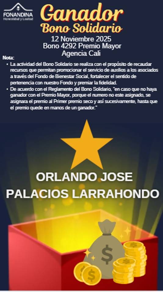 Bono Solidario Se asigna el 01 de diciembre, a los asociados activos al cierre de noviembre 30.Sortea todos los miércoles de febrero a diciembre $1.700.000Adicional en diciembre un sorteo de $48.000.000 para solución de vivienda. Para más información clic AquíConsulta nuestro último ganador AquíGanadores Bono 2025 Aquí Ahorro Crédito Bienestar Auxilios Bono Solidario Convenios Comerciales (602) 486 0202 Ext: 149 Asóciate diligenciado los formatos de vinculación, control de lavado de activos y autorización de tratamiento de datos personales Envíalos a nuestra oficina, adjuntando una copia de tu cédula de ciudadanía