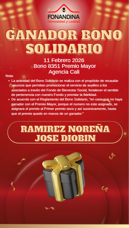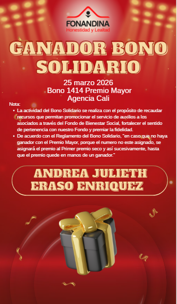 Bono Solidario Se asigna el 01 de diciembre, a los asociados activos al cierre de noviembre 30.Sortea todos los miércoles de febrero a diciembre $1.700.000Adicional en diciembre un sorteo de $48.000.000 para solución de vivienda. Para más información clic AquíConsulta nuestro último ganador AquíGanadores Bono 2026 Aquí Ahorro Crédito Bienestar Auxilios Bono Solidario Convenios Comerciales (602) 486 0202 Ext: 149 Asóciate diligenciado los formatos de vinculación, control de lavado de activos y autorización de tratamiento de datos personales Envíalos a nuestra oficina, adjuntando una copia de tu cédula de ciudadanía